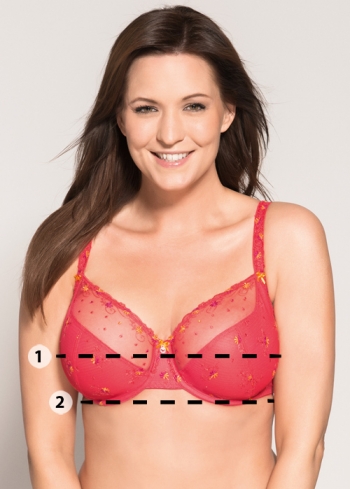 Ta på dig en BH som sitter bra och mät runt bröstkorgen där bysten är fylligast. Se till att måttbandet är rakt och inte skruvar sig. Skriv detta mått i "Mått 1".